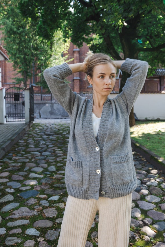 Suéter cárdigan gris para mujer con botones y bolsillos, cárdigan holgado de lana de alpaca de gran tamaño tejido a mano para mujer, prendas de punto hechas a mano Etsy España